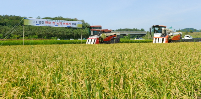 이번 첫 벼 베기는 지난해부터 포트 육묘·이앙방식 도입으로 병해충과 기온 변화에 대응하고 농업기술센터에서 생산한 유용 미생물제를 투입해 지력증진과 염류장해 개선으로 고품질 조기햅쌀 생산을 도모해 지난 3월 10일 극조생종인 ‘기라라 397’ 품종을 심은지 138일 만에 첫 수확이다.