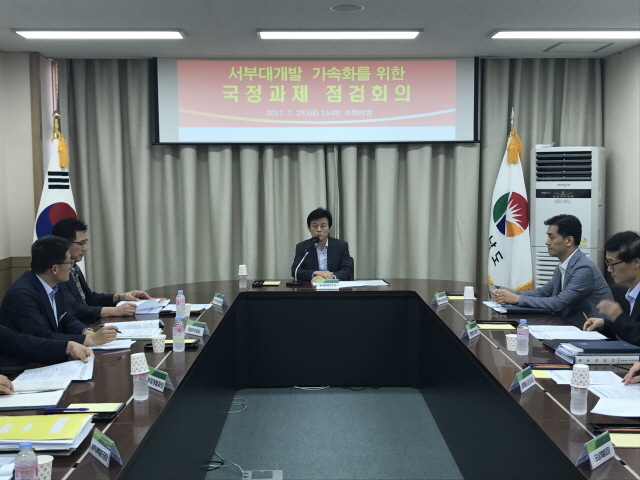 이날 점검회의는 지난 19일 국정기획자문위원회에서 발표한 국정운영 5개년 계획 (지역공약)에 반영된 서부대개발사업에 대해 진행상황을 챙기고 앞으로의 추진전략과 방안을 강구하기 위해 마련됐다.