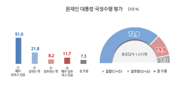 문 대통령의 국정수행 지지도 조사 결과는 잘 하고 있다 72.8%(매우 잘함 51.0%, 잘하는 편 21.8%), 잘못하고 있다 19.9%(잘못하는 편 8.2%, 매우 잘못 11.7%)로 집계됐다.