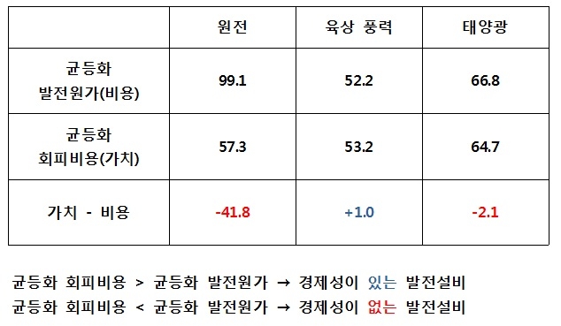 다만, 같은 논리대로라면 태양광 역시 회피 비용(64.7달러)에서 발전 원가(66.8달러)를 빼면, 마이너스 2.1달러가 되긴 한다. 반대로 육상 풍력은 1달러만큼 경제성이 있는 것으로 나온다. 이를 고려하더라도 핵발전의 경제성은 다른 발전 방식보다 떨어진다는 것이 정부의 입장이다.