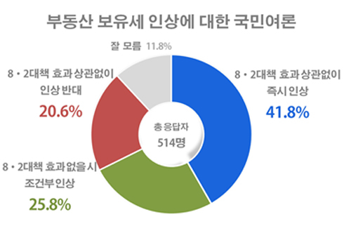 10일 여론조사기관 리얼미터는 tbs 교통방송 의뢰로 지난 9일 전국 성인 남녀 514명을 상대로 조사한 결과 8.2대책의 효과와 상관없이 즉시 부동산 보유세를 올려야 한다는 응답자가 전체의 41.8%였다고 밝혔다.