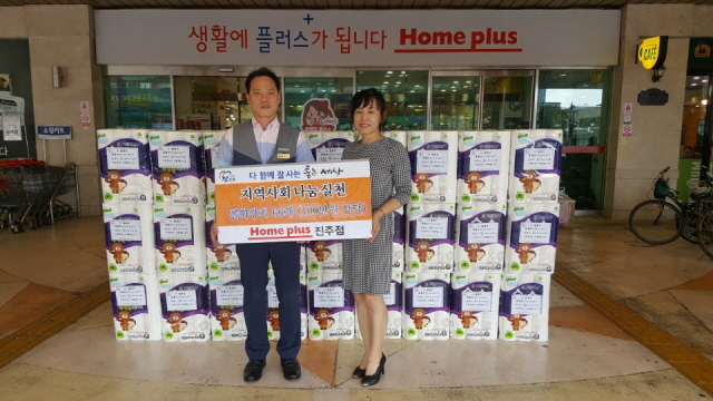 지역사회의 어려운 계층에 대한 사랑을 실천하기 위해 매분기마다 기부활동을 하고 있는 홈플러스 진주점은 화장지 및 부식류 등 600만 원 상당의 물품을 저소득층 300세대에 전달한 바 있다.