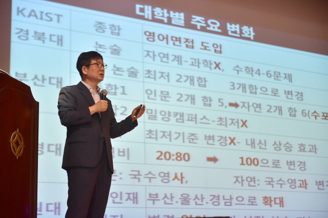 수시설명회와 맞춤형 개별상담 형식으로 진행된 이날 행사에는 허용회 전 EBS 대표강사가 2018학년도 수시모집의 특징과 전형 요소별 대비전략을 중심으로 각 대학별 입시동향 분석을, 개별상담은 진학상담교사 20명과 학생들 간 1대1로 미리 신청한 100여 명의 수험생을 대상으로 진행됐다.