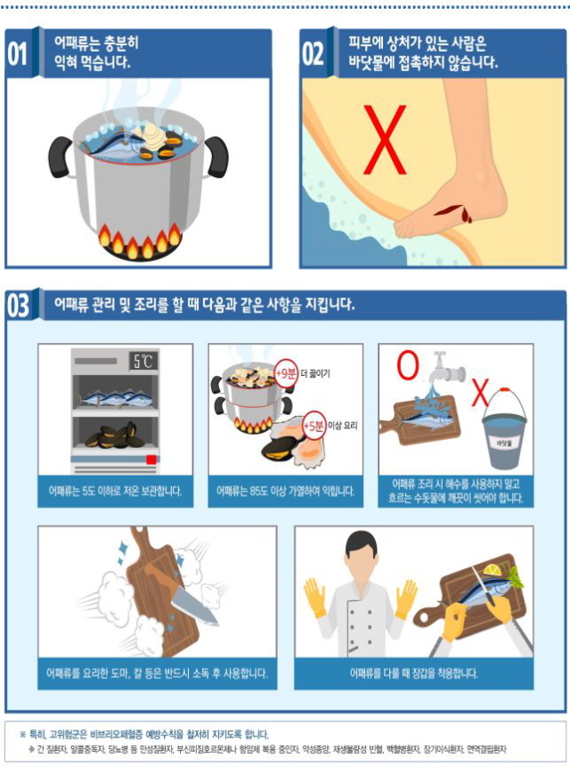 따라서 여름철 어패류는 5℃ 이하로 저온보관 또는 85℃ 이상으로 충분히 가열 처리 후 섭취하고, 어패류를 요리한 도마, 칼 등은 깨끗이 소독한 후 사용해야 비브리오감염증을 예방할 수 있다.