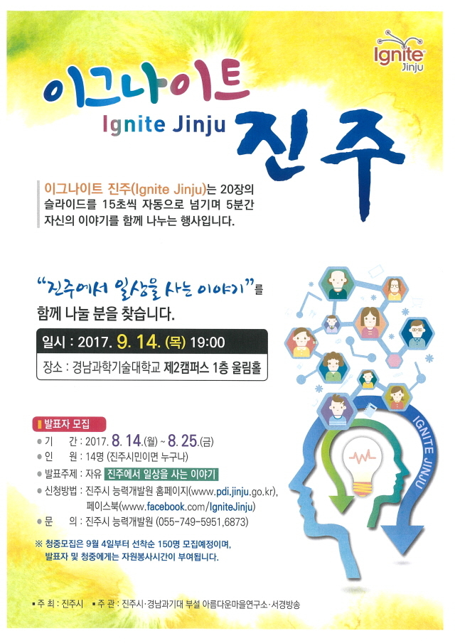 진주시민이면 누구나 신청할 수 있으며 모집인원은 14명이다. 진주에서 일상을 살아가는 평범한 시민들의 재미있고 감동적인 경험을 포함한 자유로운 주제로 발표할 수 있으며 신청서는 능력개발원 홈페이지 또는 페이스북(www.facebook.com/Ignite.Jinju)으로 제출하면 된다.