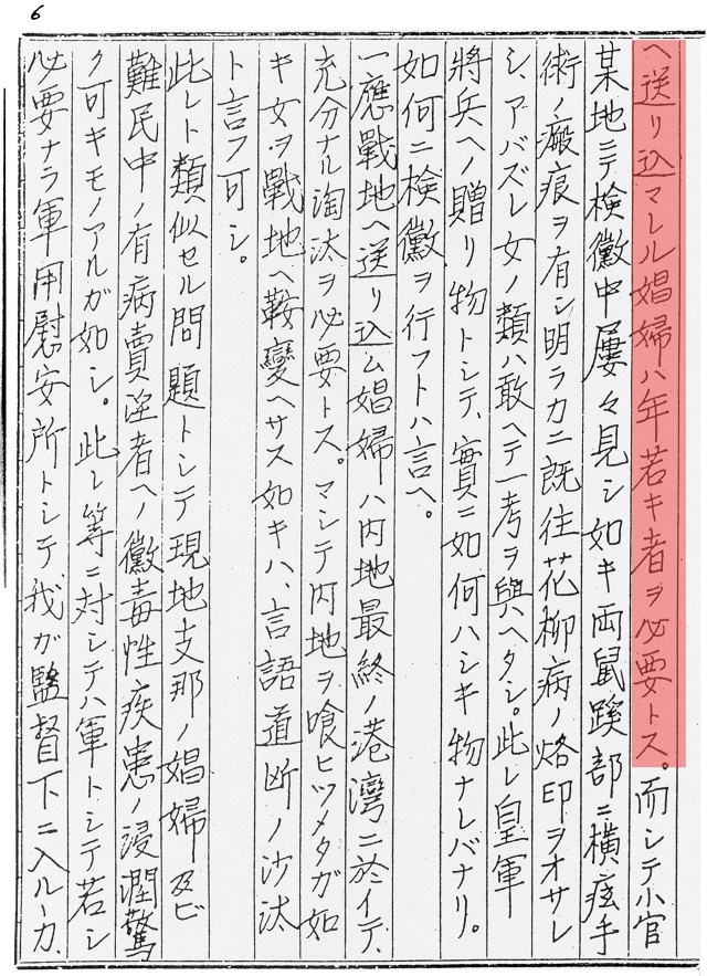 전쟁은 길어지고 전선(戰線)은 갈수록 확장되었으며 자연히 '여성 요구'가 많아졌다. 이미 전선에 여성을 끌어들여 병사들에게 버릇을 들이기 시작한 군부의 부담은 늘어날 수밖에 없었다. 어디에서 이 많은 여성들을 공급해올 것인가? 다시 아소 데스오(麻生徹男) 군의관의 보고서 <화류병(성병)의 적극적 예방법>을 보자. 아소 데스오는 보고서에서 '조선 여성 중에 성병 의심이 가는 자는 극소수이나 일본 여성은 대부분 급성 증상을 보이고 있다'고 검진소견을 쓴 다음 '조선여성은 나이가 어리다'고 평가하면서 '전선으로 보내는 창부('위안부')는 나이 어린 자를 필요로 한다'고 결론을 내렸다.