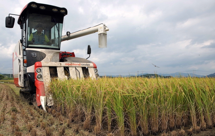산들거리는 가을바람에 다소 선선한 날씨를 보인 지난 29일 300ha 면적의 조기벼 재배단지가 있는 전남 강진군 도암면 들녘에서 콤바인으로 벼 수확에 나선 농부 얼굴에 풍년의 기쁨이 묻어난다.