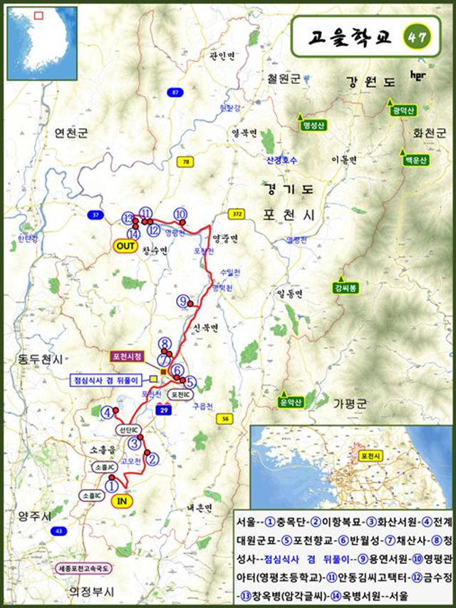 이날 답사코스는 서울-충목단-이항복묘-화산서원-전계대원군묘-포천향교-반월성-채산사-청성사-점심식사 겸 뒤풀이-용연서원-영평관아터(영평초등학교)-안동김씨고택터-금수정-창옥병(암각글씨)-옥병서원-서울의 순입니다.