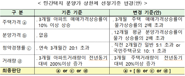 기존 분양가 상한제는 △3개월간 아파트 매맷가 상승률이 10% 이상 오르거나 △청약경쟁률이 3개월 연속 20대 1을 넘거나 △3개월간 아파트 거래량이 전년 동기 대비 200% 이상 올라야만 분양가 상한제 적용 대상이 됐다.