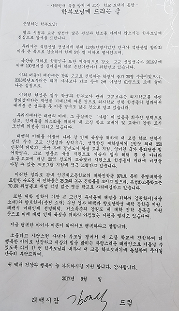 강원 태백시가 고교입시 지원 원서 신청을 앞두고 관내 중학교 3학년 학부모 400여 명에게 ‘내고장 학교 보내기’ 운동에 적극 동참 해 줄 것을 요청하는 서한문을 발송한다.