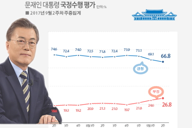 이는 지난 7월 2주차 때의 74.6%에 비하면 8.8%포인트 하락한 것으로, 전반적으로 완만하게 지지율이 내려가는 추세로 보인다. 직전 조사인 9월 1주차와 비교하면, 지역적으로는 대구·경북 지역(57.6% → 48.9%), 연령별로는 60대 이상(49.7% → 39.1%)에서 지지율이 크게 하락했다.