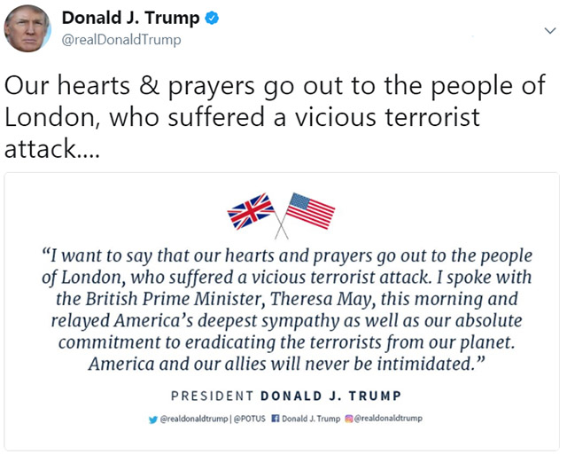 이에 트럼프 대통령은 이후 성명을 통해 "메이 총리와 통화에서 위로의 말을 전했고 테러를 몰아내기 위해 헌신하겠다는 뜻을 밝혔다"며 영국 국기와 미국 국기가 함께 놓인 그림과 함께 성명의 내용을 트위터에 띄워 사태를 수습했다.