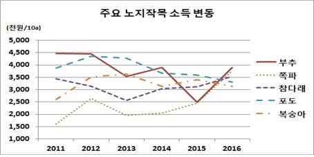 노지재배 작목의 10a당 소득은 부추가 3,900만원, 쪽파 3,800만원, 참다래 3,500만원, 포도 3,300만원, 복숭아 3,100만원 순으로 조사됐다.