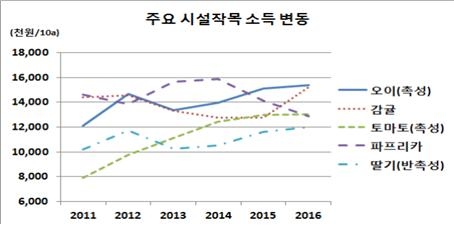 시설재배 작목의 10a당 소득은 오이(촉성) 1억5,400만원, 감귤 1억5,200만원, 토마토(촉성) 1억3,000만원, 파프리카 1억2,900만원, 딸기(반촉성) 1억2,000만원 순이다.