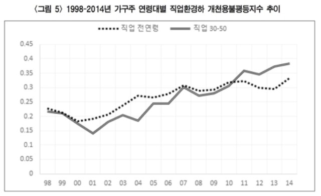 논문은 한국노동패널 1차(1998년)에서 18차(2015년) 자료를 토대로 1998년, 2003년, 2008년, 2014년 가구주 연령 30∼50대 가구의 가처분소득을 중심으로 분석했다.