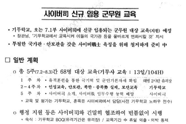 이 의원이 공개한 '사이버사 신규 임용 군무원 교육' 문건을 보면, 국방부는 "임용 전 전교조 교육 및 사회 현상에 노출된 점과 임무의 중요성 등을 고려, 안보관, 종북勢 실세, 보안교육 등에 중점을 두고 교육"하라고 지시했다.
