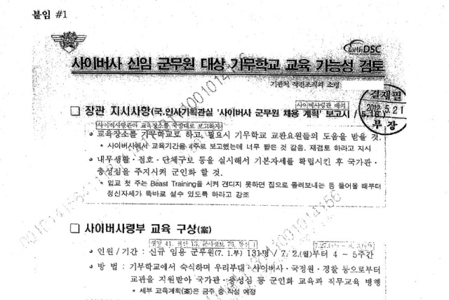 국회 국방위원회 소속 이철희 의원(더불어민주당)은 26일 '사이버사 신규 임용 군무원 교육', 'C사령부 신규 임용 군무원 교육계획' 등 3건의 문건을 입수·공개했다. 이 가운데 '사이버사 신규 임용 공무원 교육' 문건과 2012년 5월 작성된 '사이버사 신임 군무원 대상 기무학교 교육 가능성 검토' 문건에는, 신임 군무원들을 기무학교에 입소시켜 교육하라는 것이 '장관 지시사항'이었다고 명시돼 있다.