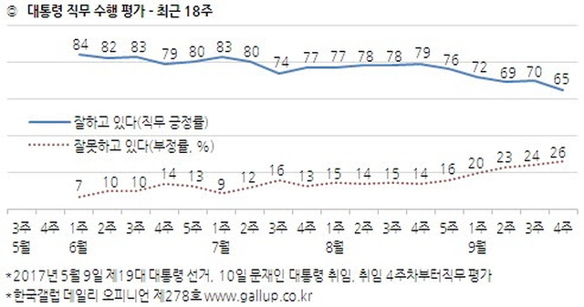 29일 여론조사 기관 '한국갤럽'에 따르면, 이 기관의 9월 4주 정례 조사에서 문 대통령이 대통령 직무 수행을 '잘 하고 있다'는 응답은 65%, '잘못하고 있다'는 응답은 26%로 집계됐다.