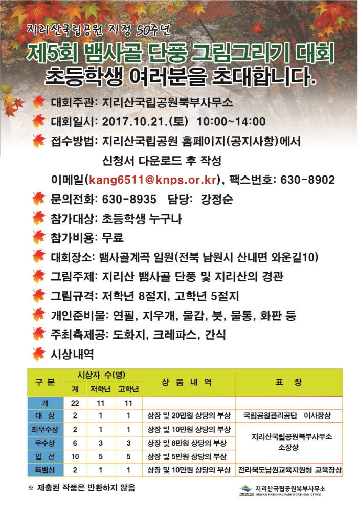 지리산국립공원북부사무소가 오는 21일 토요일 오전 10시부터 지리산 뱀사골 일원에서 ‘제5회 지리산뱀사골 단풍 그림그리기 대회’를 개최한다.