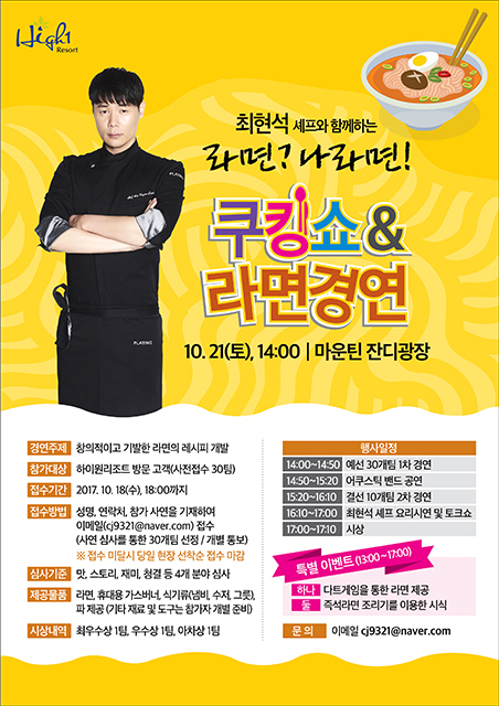 하이원리조트(대표 함승희)가 오는 21일 마운틴잔디광장에서 열리는 ‘최현석 셰프와 함께하는 라면 경연’의 참가자를 모집한다.