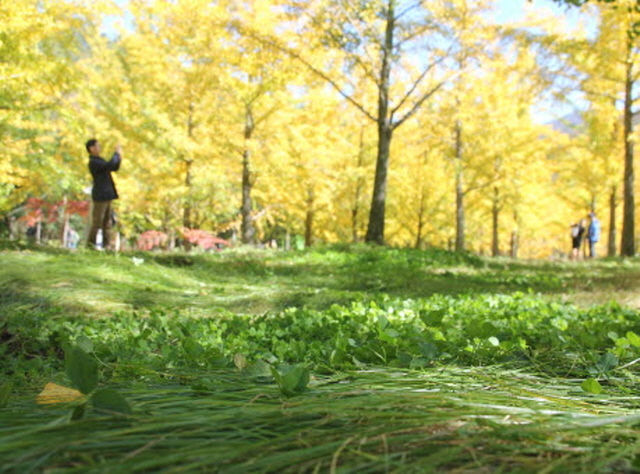 나무 아래는 잘 심어져 있는 초지가 파아란 하늘을 향해 뻗은 은행나무색깔과 너무 잘 어울린다.