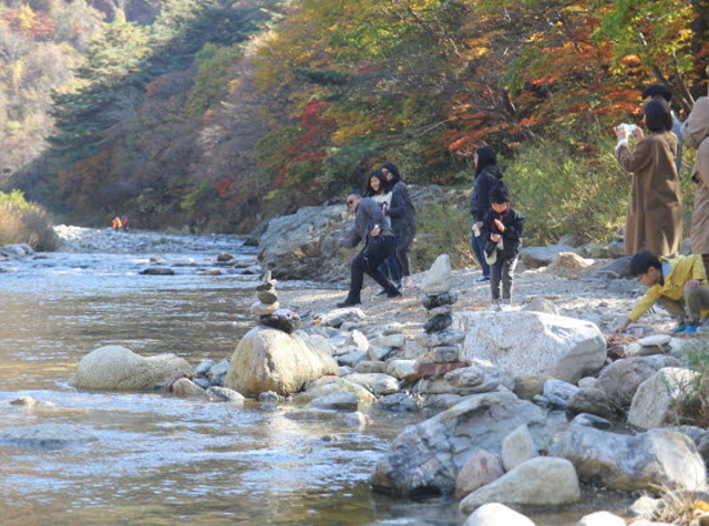 크고 작은 돌을 강가에 탑처럼 쌓아놓은 시냇물을 보았다. 물을 좋아하는 아이들이 은행나무 색깔만큼 좋아하는 곳이 시냇물이다.