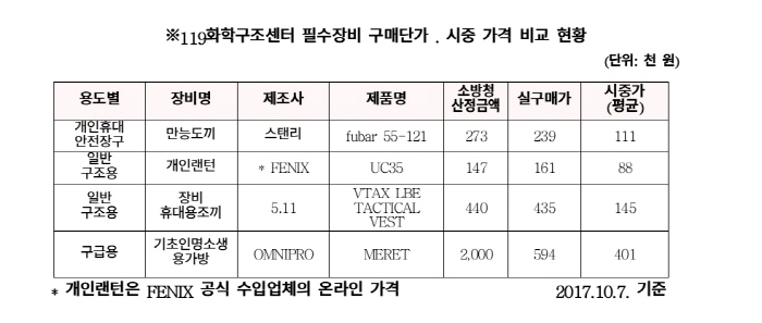 예를 들어, 일선 소방관서에서 사용하는 만능도끼의 경우 시중가가 11만1000원이었지만 구조본부는 23만9000원에 구입했고, 시중가 8만8000원짜리 랜턴은 16만1000원에 구입했다.