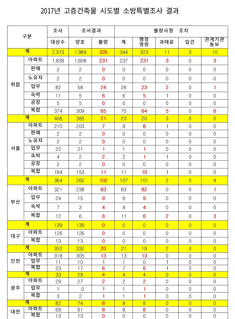 16일 국회 행정안전위원회 소속 이용호 의원(국민의당, 전북남원·임실·순창)이 소방청으로부터 제출받은 '2017년 고층건축물 소방특별조사 실시 현황' 분석 자료에 따르면 전국 30층 이상 고층건축물 2315개 중 326개(14%)가 화재 대비 불량인 것으로 밝혀졌다.