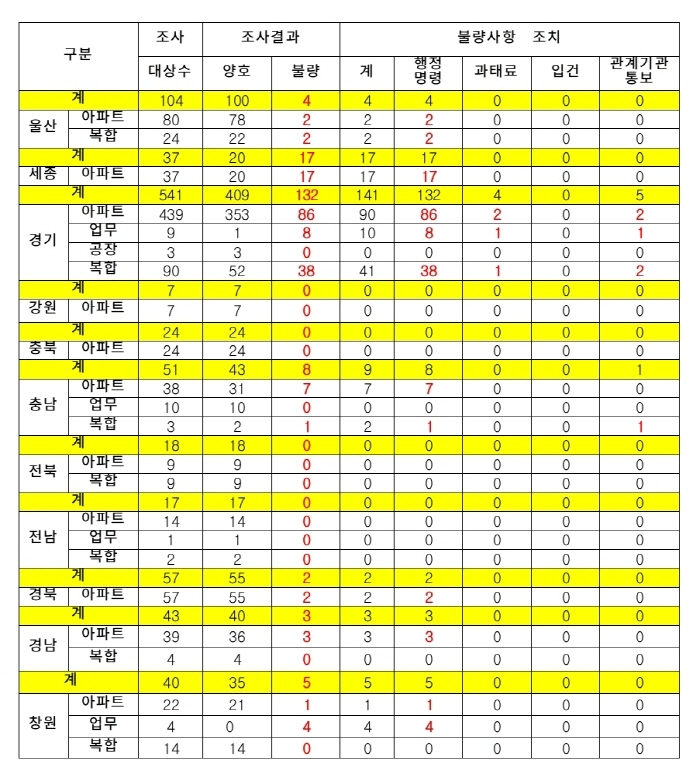 지역별 고층건축물 화재 대비 불량률은 경기가 132개로 제일 많았고, 부산 102개, 서울 21개, 인천 20개, 세종 17개, 대전․충남 8개, 창원 5개, 광주․울산 4개 경남 3개, 경북 2개 순 이다.