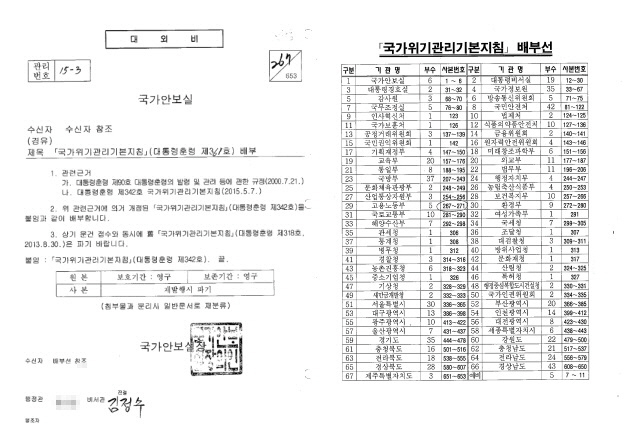 실제로 지난 13일 국회 보건복지위원회의 보건복지부 국정감사에서도 민주당 기동민 의원은 "세월호 사고 이후 청와대 국가안보실로부터 '국가안보위기관리지침' 수정 지침을 통보받은 적 있느냐"고 물었고, 복지부에서는 "지침 일부를 수정하라는 문서를 비밀 형태로 통보받았다"고 답한 일도 있었다. 한 의원이 공개한 '지침' 공문 배부선을 보면, 이 지침 수정본은 노동부와 복지부 등 중앙부처와 광역단체 등 총 67개 기관에 배포됐다.