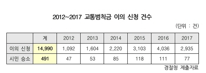 한편, 같은 기간 교통범칙금 부과에 대한 이의 신청 건수는 총 1만4990건으로 ’12년 1092건, ’13년 1604건, ’14년 2220건, ’15년 3103건, ’16년 4036건, ’17년 2935건이다. 이중 즉결심판 등이 진행돼 시민의 이의 신청이 받아들여진 경우도 총 491건이었다.