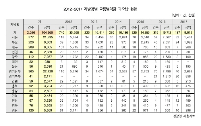지방청별로 가장 과오납 사례가 가장 많은 곳은 경기청(남·북부청 합계)으로 2012년 이후 총 406건·2489만원을 기록했다. 다음으로는 △서울(377건·2200만원) △부산(220건·980만원) △대구(209건·886만원) △광주(112건·709만원)가 뒤를 이었다. 가장 사례가 적은 곳은 △대전(22건·94만원) △인천(46건·234만원) △울산(56건·239만원) △전북(55건·248만원) 순이었다.