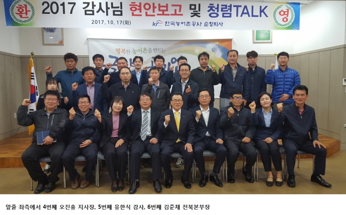 이날 유한식 상임감사는 순창지사 오진휴 지사장으로부터 지사 현안사항 및 반부패 추진계획을 청취하고, 부패척결 및 청렴의식 고취를 위해 직원들과 자유롭고 스스럼없는 대화를 나눴다.
