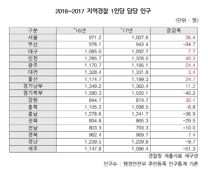 인천의 경우 인구는 4700명 늘어났는데 지역경찰은 66명 감소해 1인당 담당 인구가 전년대비 40명 이상 증가('16년 1286명→'17년 1326명)했다.