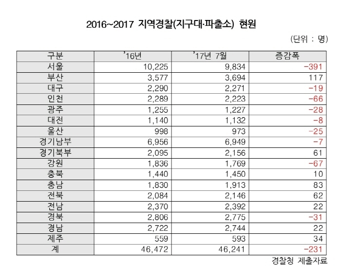 반대로 부산(117명), 충남(83명), 전북(62명), 경기북부(61명), 제주(34명), 경남·전남(22명), 충북(10명) 등은 지역경찰이 늘었다.