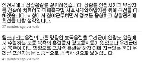 송 시장은 당시 자신의 트위터에 "팀스피리트 훈련의 다른 명칭인 호국훈련을 우리 군이 연평도 일원에서 수행하는 도중 북측의 훈련중지 경고통지 등이 있었으나 우리 군에서 북측이 아닌 방향으로 포사격 훈련을 하자 이에 자극받은 북이 우리 군 포진지 등을 집중적으로 공격한 것으로 보여집니다"라고 적었다.