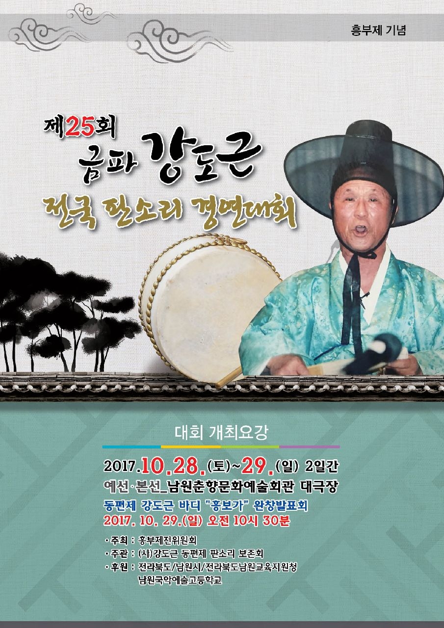 일반부, 신인부(단체 및 개인), 고등부, 중등부, 초등부 부분으로 나눠 동편제 강도근 흥보가 완창 발표회와 함께 본선이 치러진다.