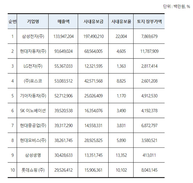 사내유보금이 가장 높은 기업은 삼성전자로, 지난해 기준 197조4902억 원의 유보금을 확보했다. 2위인 현대자동차의 68조5640억 원보다 3배 이상 많았다.