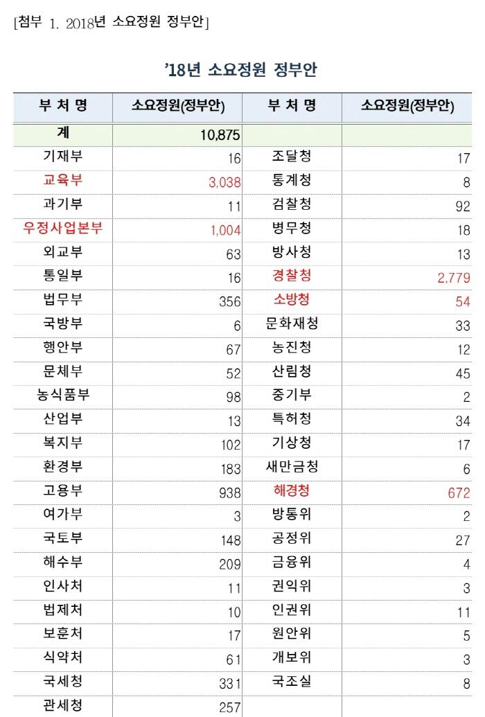 당초 기획재정부는 2018년 예산안을 책정하며 내년에 1만5000명의 공무원 증원을 계획했다. 그러나 이 의원이 행정안전부로부터 확인한 바에 따르면 실제 증원 규모는 군부사관까지 포함해 1만2000명이다. 정부의 당초 계획에 비해 3000명 가량 줄었다.