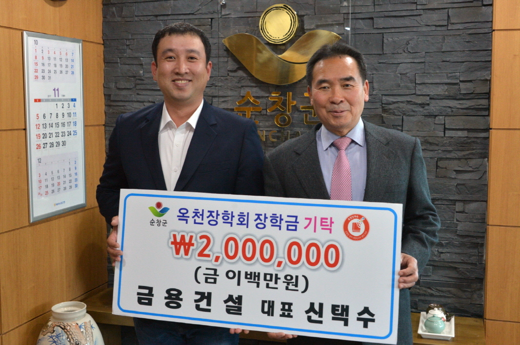 최근 순창읍 소재 건설업체인 금용건설산업 신택수 대표가 순창군의 지역인재양성을 위한 장학금에 써달라며 옥천장학회에 200만원을 전달했다.