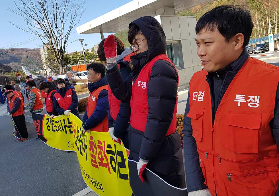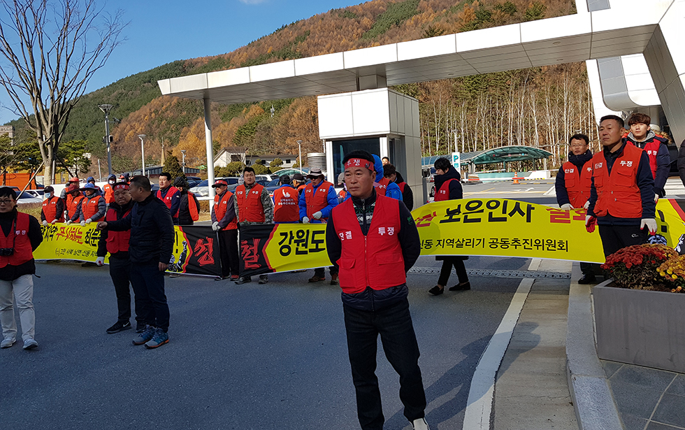 ▲15일 강원 정선군 고한읍 강원랜드 행정동 입구에서 고한사북남면신동지역살리기공동추진위원들이 낙하산 사외이사 추천 백지화를 촉구하며 사추위원들의 입장을 저지하고 있다. ⓒ프레시안
