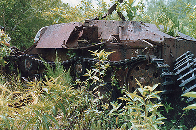 태평양전쟁 자료필름에는 남양군도의 일본군이 모자에 방충망을 달고 전투에 나서는 모습이 보인다. 연합군이 미세한 모기를 배양하여 일본군이 주둔한 남양군도에 살포했기 때문이라는 설명이 곁들여 있다. 김정곤 씨가 설명한 모기가 바로 그 모기일지도 모를 일이었다. 우리는 섬을 오른쪽으로 돌아 이 섬 유일한 선착장에 배를 대었다. 그곳에 김 씨의 트럭이 있었다. 바삭바삭 낡고 작은 짐차였다. 김 씨의 차는 무성한 잎을 스치며 좁다란 길을 따라 정글 속으로 들어갔다. 군데군데 일본군의 진지가 보였고, 거미줄과 넝쿨이 뒤섞여 팔랑거리는 일본군 지휘부 건물이 유령처럼 거무튀튀하게 서 있었다. 이따금씩 대공포와 전차들이 세월 그대로 방치되어 있어서 아직도 전쟁의 포염이 식지 않은 느낌이었다. 무표정한 두 사람과는 달리 나는 그 전장(戰場)에 왔다는 임장감(臨場感)으로 긴장했고 내 눈은 분주했다.