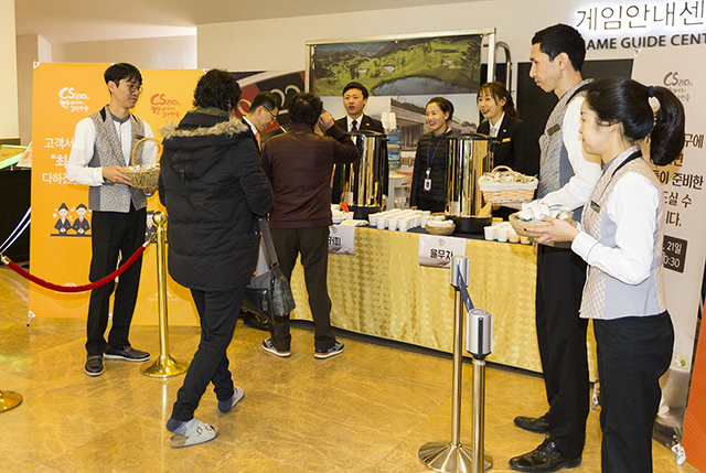 이날 행사에는 CS(Customer Satisfaction)리더 직원과 영업직원을 포함해 총 15명의 직원들이 참여했으며, 카지노 입장을 기다리는 손님들에게 율무차, 커피, 녹차 등 웰컴티와 간식을 제공했다.