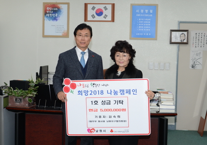 1호 천사기부자 김숙희(법무부 법사랑 남원지구협의회장) 회장은 지역 내 소외된 어려운 이웃을 위해 성금 500만원을 21일 전달했다.