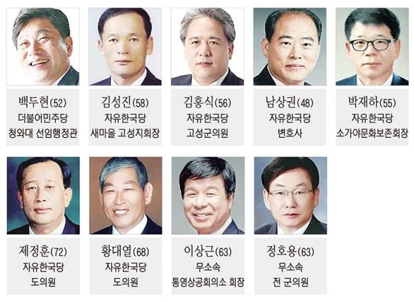 여당 후보인 백두현 청와대 지방자치분권 선임행정관을 비롯해 김성진 새마을운동 고성군지회장, 김홍식 군의원, 남상권 변호사, 박재하 소가야문화보존회장, 이상근 통영상공회의소 회장, 정호용 전 군의원, 제정훈 도의원, 황대열 도의원 등 9명이다.