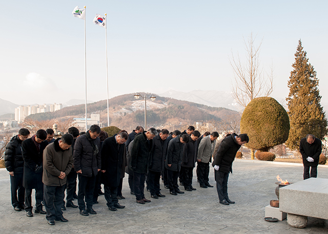 이날 시무식에 앞선 오전 8시 30분, 김연식 시장이 실과소동장과 신년하례를 가진 뒤 충혼탑과 위령탑을 함께 참배했다.