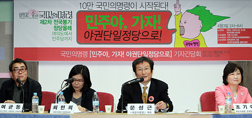 문성근 '100만 민란' 대표는 "(4.27 재보선 관련 야권연대 협상을 보더라도) 야권 단일정당의 필요성을 다시 확인할 수 있다"며 "지금 같은 방법으로 최강의 후보를 뽑을 수 있는지, 단일 후보가 만들어진 다음에도 탈락하거나 양보한 정당의 지지자들이 단일 후보를 자기 정당 후보만큼 지지할지 대단히 의심스럽다"고 주장했다.