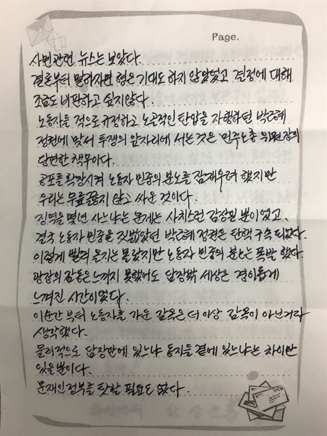 이어 그는 "노동자를 적으로 규정하고 노골적인 탄압을 자행한 박근혜 정권에 맞서 투쟁의 앞자리에 서는 건 민주노총 위원장의 당연한 책무"라며 "징역을 몇 년 사느냐는 문제는 사치스런 감성일 뿐이었다"고 강조했다.