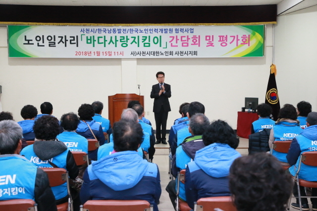 경남 사천시는 15일 대한노인회사천시지회에서 한국남동발전, 한국노인인력개발원 관계자를 비롯한 바다사랑지킴이단 50여명이 참석한 가운데 ‘바다사랑지킴이단’간담회 및 평가회를 개최했다.