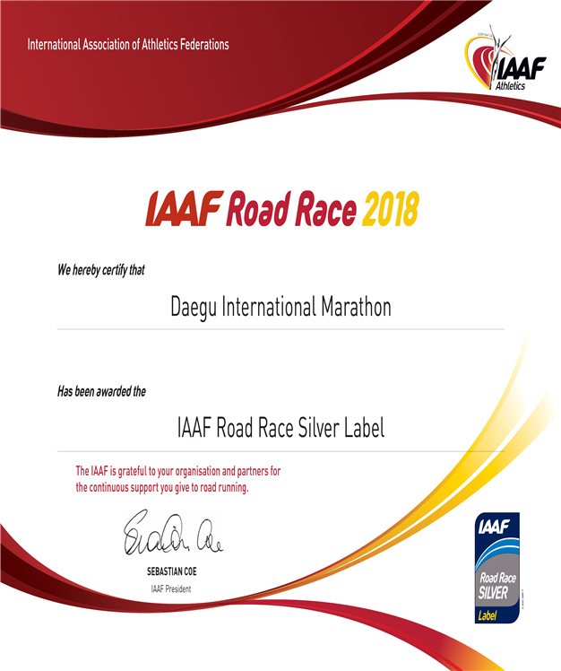 국제육상연맹은 2017대구국제마라톤대회의 선수 기록과 국적·인원·미디어서비스·도핑검사·중계방송·보험·삼금·전광판 등 15개 항목에 대한 종합 평가를 실시하고 ‘실버라벨’ 조건을 충족했다며 인증서를 보내왔다.